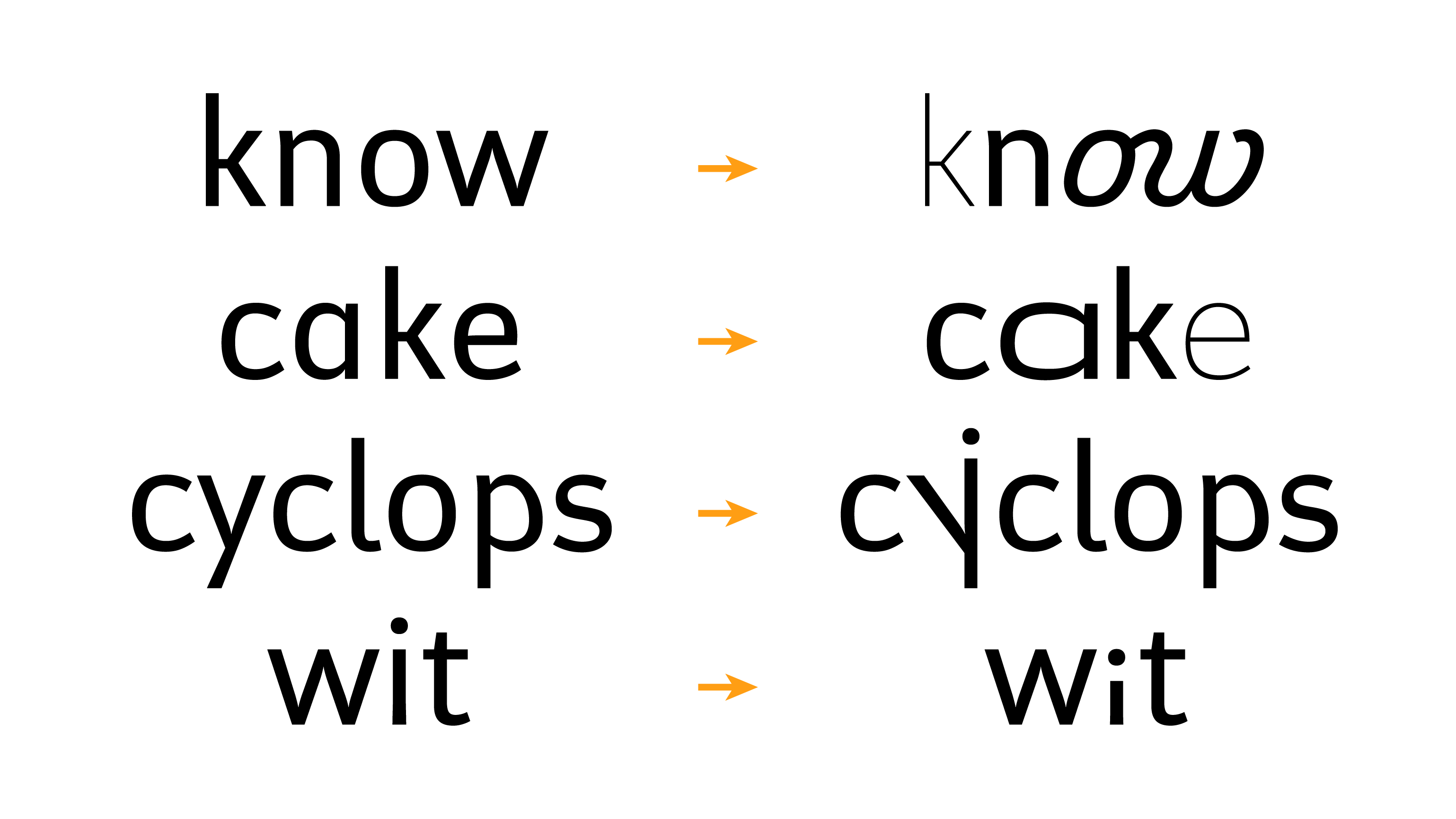 Squishee Squashee is an experimental typeface designed to animate letters within words, making orthographic patterns in the English language visible. This smart font recognizes common spelling patterns and dynamically animates the corresponding letters to highlight these structures in real time. In the word "cake," watch as the letter "a" stretches like it's enjoying a yawn—it's a long 'a'! And keep an eye on the 'e' as it goes from regular to a lighter weight because it's being a bit shy and silent.