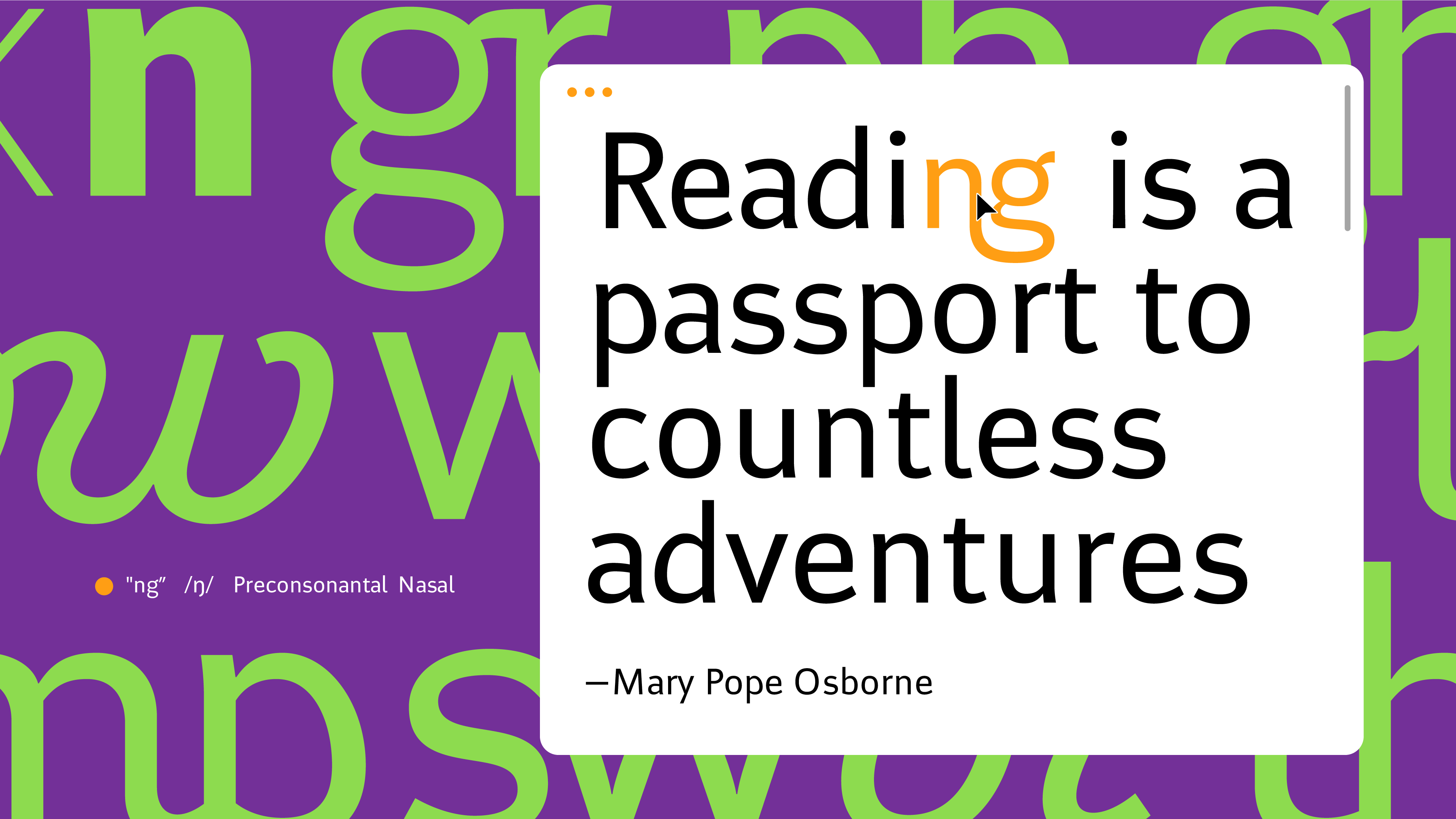 Squishee Squashee is a variable font that combines dynamic animation with clear, accessible visuals to illuminate the rules that govern English spelling. It covers key spelling categories ensuring that learners can navigate English orthography with confidence. Animated letters and letter pairs provide an engaging and intuitive way to internalize these spelling patterns.