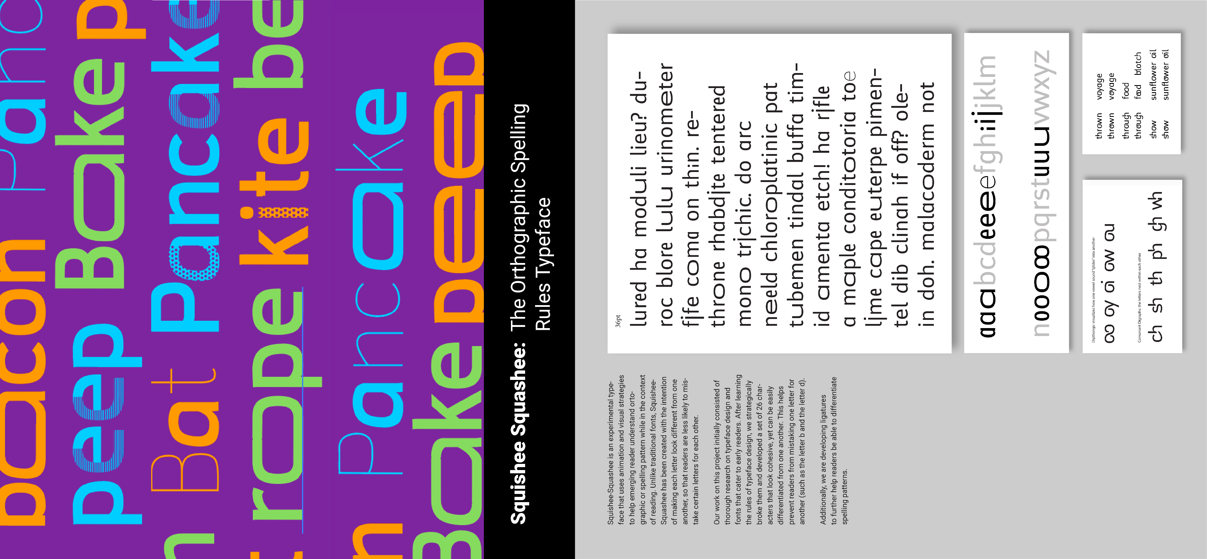 Squishee Squashee was designed in response to decades of research in reading and orthography. Squishee Squashee is a variable font that combines dynamic movements and easy-to-read visuals to demystify the rules that govern English spelling.
